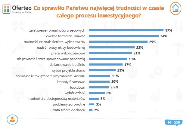 Wśród największych trudności napotkanych podczas procesu inwestycyjnego, niezmiennie od lat najczęściej wymieniane są problemy w załatwieniu formalności. W 2020 roku ten proces dodatkowo skomplikowała pandemia. Co trzeci badany wspomniał, że trudne było dla niego znalezienie ekipy budowlanej, a co piąty źle ocenia jej nadzorowanie. Wśród największych przeciwności wymieniano również stres spowodowany pandemią, zbilansowanie budżetu, a także lockdown.